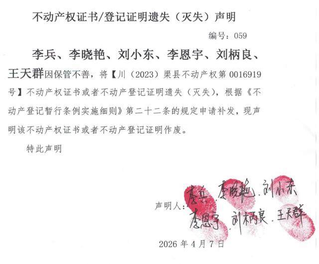 不动产权证书遗失登记公告--李兵、李晓艳、刘小东、李恩宇、刘柄良、王天群