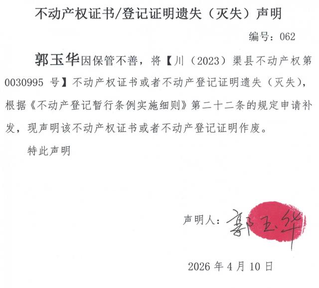 不动产权证书遗失登记公告--郭玉华